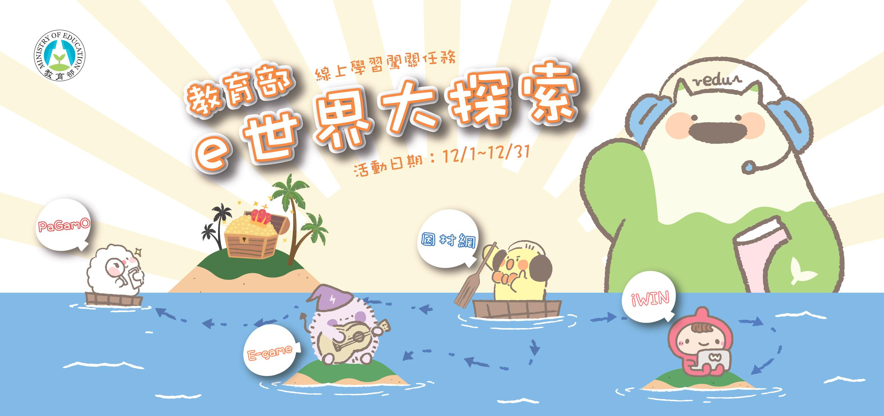 自本(110)年 12 月 1 日至 12 月 31 日止舉辦【「e 世界大探索」線上學習闖關任務】活動,歡迎同學們踴躍參加!