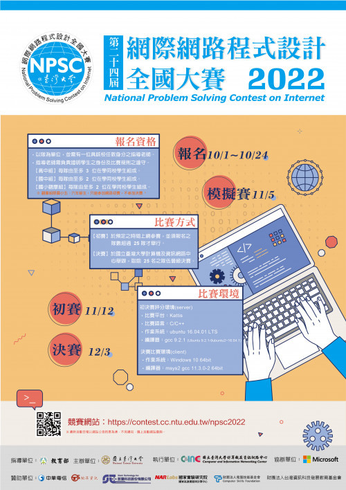 六、檢附參賽辦法及活動海報,詳附件。http://contest.cc.ntu.edu.tw/npsc2022/npsc2022poster.jpg。