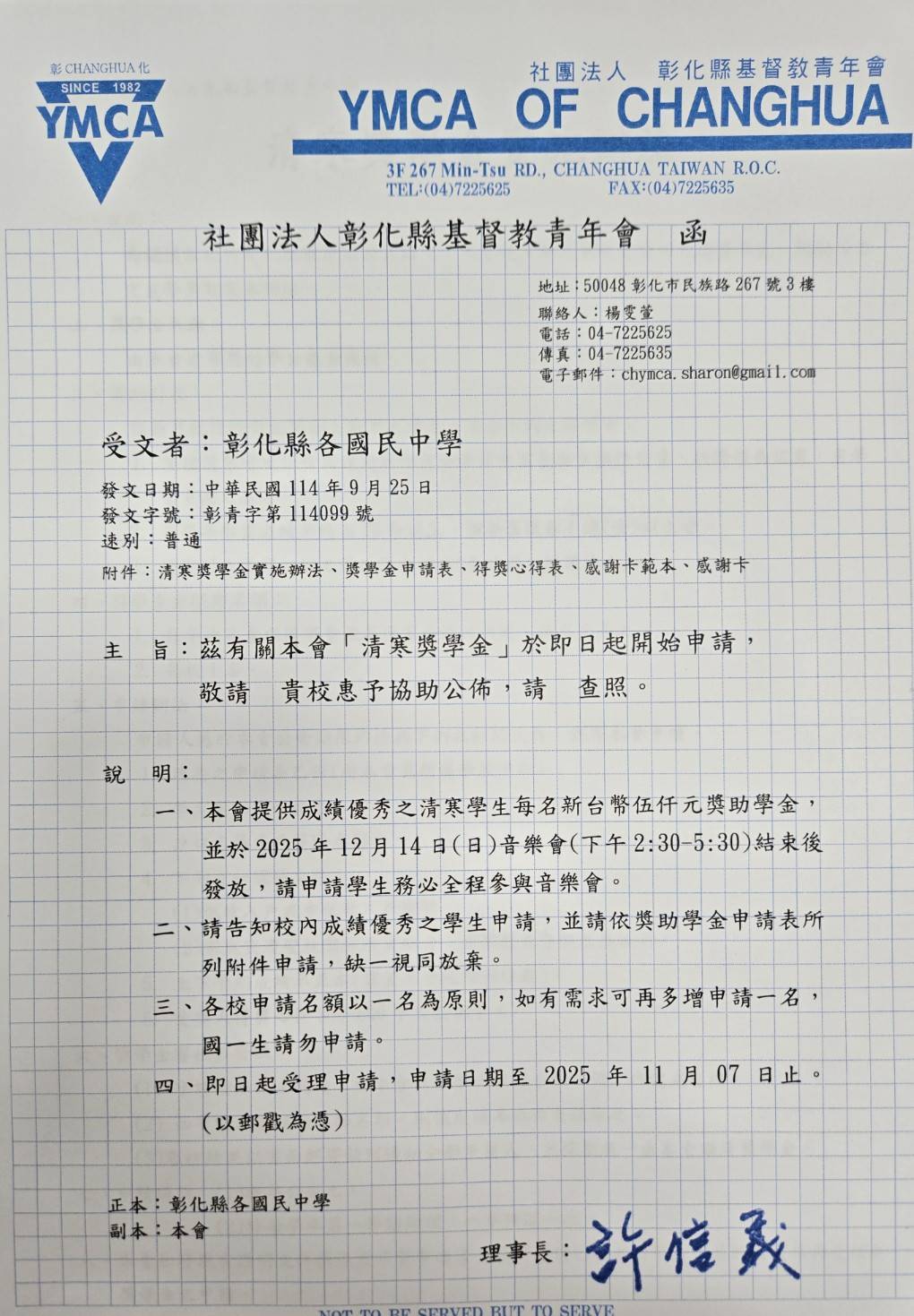 申請資格:(1)中低/低收戶或家庭變故者,八九年級學生(2)成績75分以上 (3)無過記錄,(4)獎學金金額$5000元(需到彰化會館領取),(5)全校1位名額,有意申請者請於10/15前洽註冊組